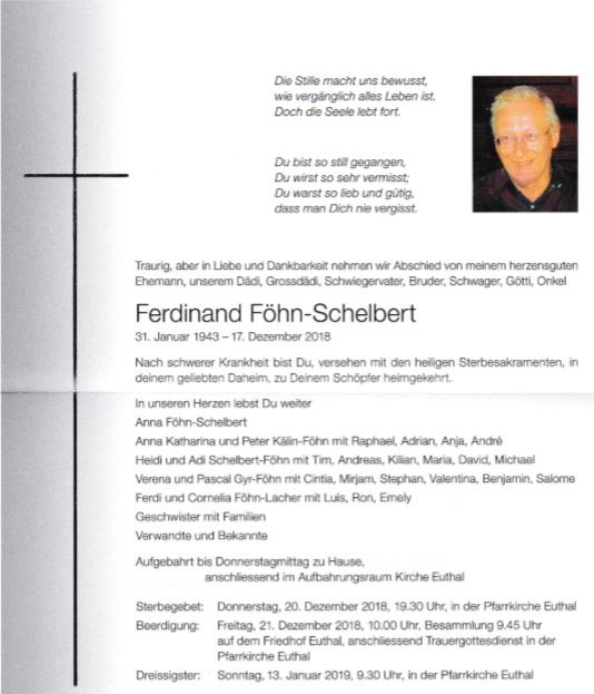 Wir trauern um unseren Ordensbruder Ferdinand, der am 17.Dezember 2018 verstarb. Ferdinand war seit März 2005 Mitglied unserer Gemeinschaft, er wird uns fehlen. Der Herr möge ihn aufnehmen in seine Herrlichkeit!